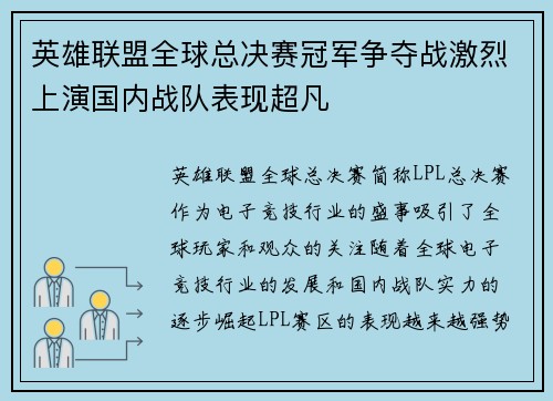 英雄联盟全球总决赛(简称LPL总决赛)作为电子竞技行业的盛事,吸引了全球玩家和观众的关注。随着全球电子竞技行业的发展和国内战队实力的逐步崛起,LPL赛区的表现越来越强势,战队在全球总决赛中的表现令人瞩目。特别是近年来,国内战队的优异成绩和国内选手的超凡表现使得全球赛场的竞争变得更加激烈,英雄联盟全球总决赛冠军的争夺也愈发紧张。本文将从四个方面详细阐述英雄联盟全球总决赛冠军争夺战激烈上演,国内战队表现超凡的背后因素,分别为:国内战队实力提升,赛区环境的进步,选手个人的卓越发挥,以及战术层面的突破。通过这些方面的分析,展现出国内战队在国际舞台上崭露头角的原因,并对未来LPL赛区的潜力进行展望。